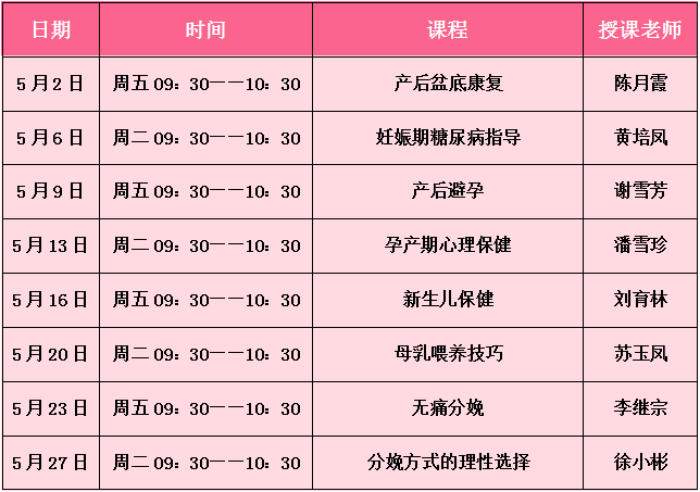 【孕婦學(xué)?!亢谩霸小毕喟椤袐D學(xué)校5月份課程安排表,請(qǐng)查收!