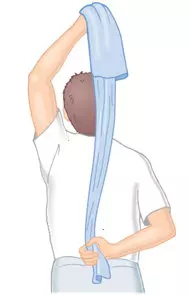毛巾訓(xùn)練:健側(cè)手拿毛巾,背向后方,患側(cè)手向后方握住毛巾另外一端,健側(cè)手手做向上提拉的動(dòng)作,帶動(dòng)患側(cè)肢體向后上方逐漸移動(dòng)。