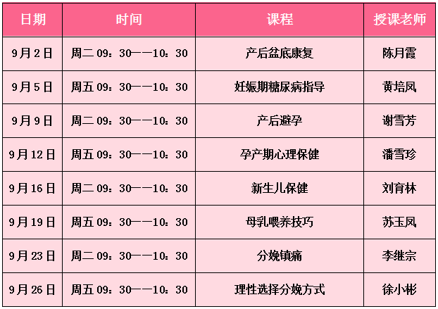 【孕婦學(xué)?!亢谩霸小毕喟椤袐D學(xué)校9月份課程安排表,請(qǐng)查收!