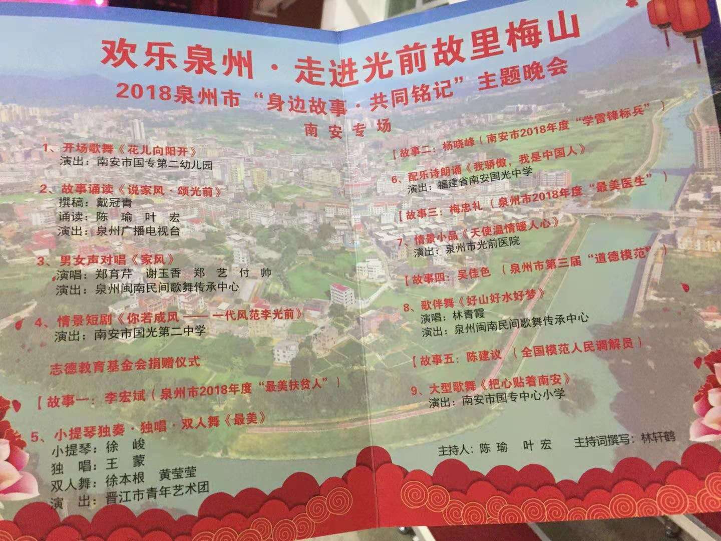 10月18日,今年是愛國僑領(lǐng)李光前先生誕辰125周年,我院積極參與系列紀(jì)念慶典活動,并創(chuàng)作紀(jì)念感恩僑親展現(xiàn)醫(yī)務(wù)員工暖心服務(wù)風(fēng)采的情景小品節(jié)目《天使溫情暖人心》參演“歡樂泉州·走進光前故里梅山——2018泉州市‘身邊故事·共同銘記’主題晚會(南安專場)”。晚會上還播放了泉州廣播電視臺錄制的視頻《故事三:梅忠禮(泉州市2018年度‘最美醫(yī)生’)》,以及晚會主持人現(xiàn)場采訪梅忠禮醫(yī)生,正面宣傳我院“暖心服務(wù)”三年行動。