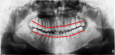 ???????牙周相對(duì)健康患者牙槽骨的高度(紅線表示每個(gè)牙齒牙槽骨最高點(diǎn)的連線)