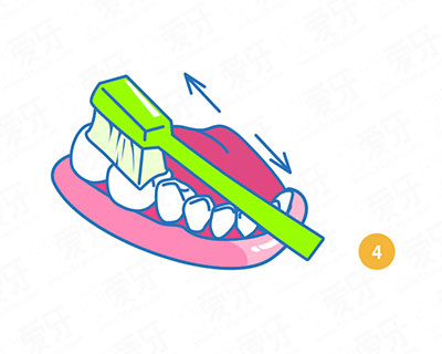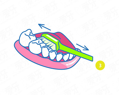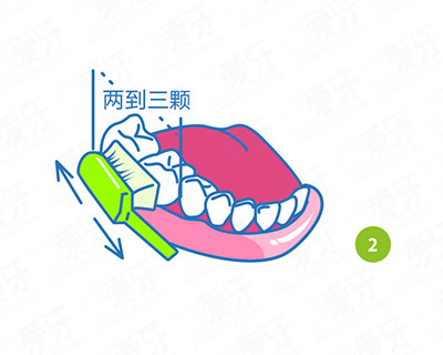 2.牙刷定位后,開始作短距離的水平運(yùn)動(dòng),兩顆到三顆牙前后來(lái)回約刷10次。