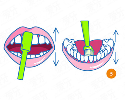 5.刷門牙的時(shí)候有點(diǎn)特殊,要把牙刷豎起來(lái),一顆一顆的上下來(lái)回刷,內(nèi)外都要刷到。