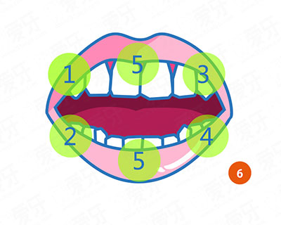 6.只要循序的刷便不會(huì)有遺漏。每個(gè)區(qū)域刷30秒左右。一區(qū):先刷左邊上面二區(qū):再刷左邊下面三區(qū) : 刷刷右邊上面四區(qū) : 再刷右邊下面五區(qū) : 單獨(dú)刷上,下門牙