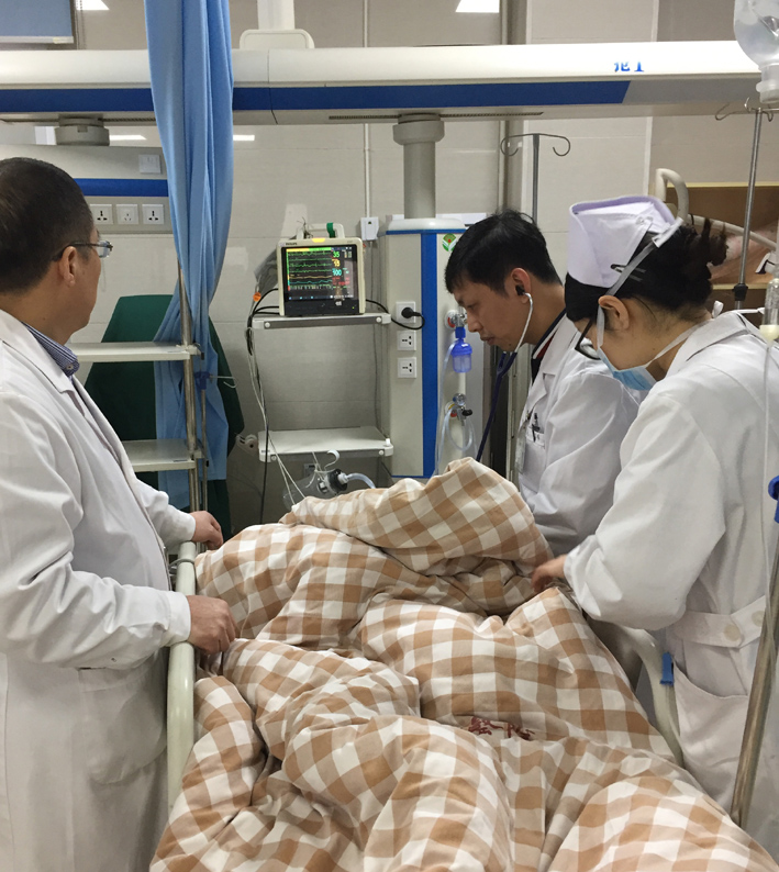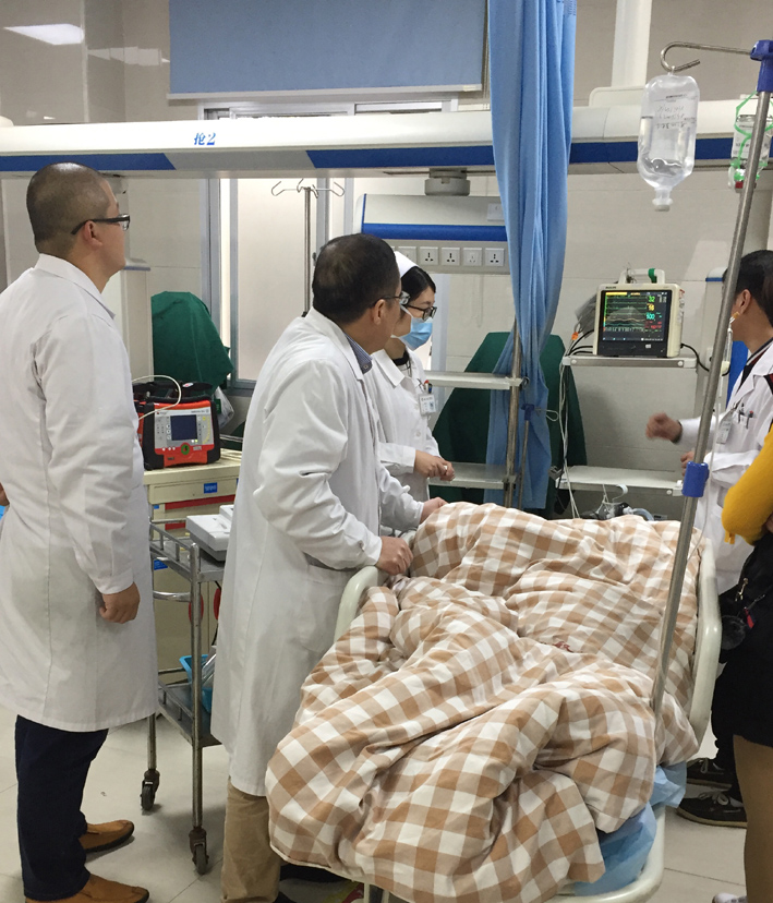 2019年3月7日上午,淅淅瀝瀝的春雨不停地下著,急診科醫(yī)生們一如往常地進行著查房、開醫(yī)囑等工作。8:20,“醫(yī)生……醫(yī)生……”,突然傳來緊急的呼叫聲,一群人抬著一位阿姨沖進急診科搶救室。急診科戴劍主任等醫(yī)生和護士們立即放下手中的工作,幫忙把病人護送到搶救床上。