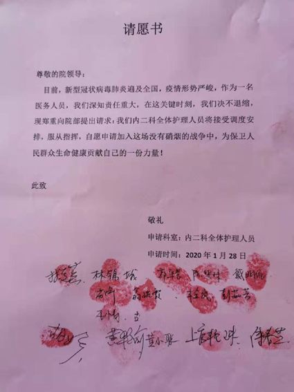 楊宇輝副主任醫(yī)師向院部書面申請:“我雖然是腫瘤內(nèi)科醫(yī)生,但我是入黨積極分子,而且數(shù)年前直接參與了人感染禽流感病人的救治工作,有一定工作經(jīng)驗(yàn),請求讓我到傳染病房參加這次戰(zhàn)斗?!痹S多中共黨員、學(xué)科骨干帶頭,廣大醫(yī)務(wù)工作者紛紛主動請纓上疫情防治一線,充分詮釋“敬佑生命、救死扶傷、甘于奉獻(xiàn)、大愛無疆”職業(yè)精神,生動體現(xiàn)了白衣天使不忘醫(yī)者初心,守護(hù)群眾生命健康。在醫(yī)院指揮和保障崗位,全員堅守崗位,認(rèn)真履職,協(xié)調(diào)全院防控工作,確保一線防治工作的各項(xiàng)保障及時、工作到位,全力以赴打好這場形勢嚴(yán)峻的阻擊戰(zhàn)。