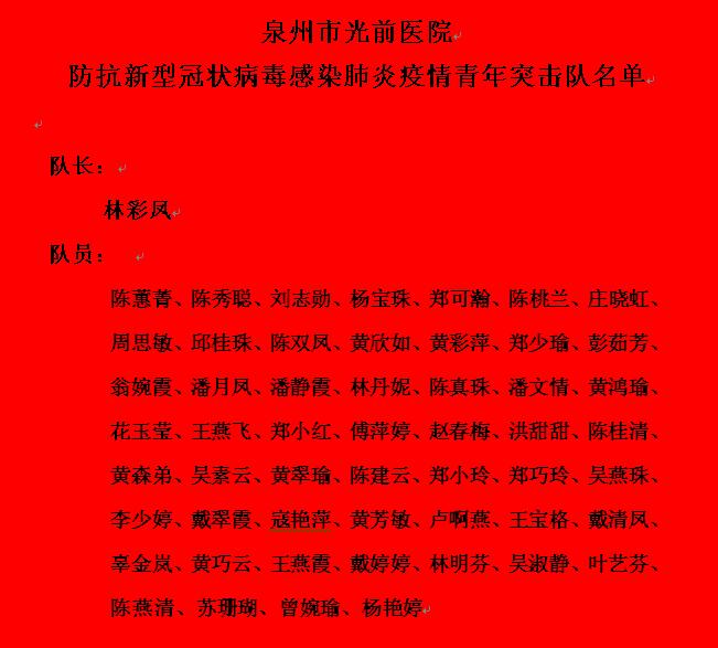 組建通知?jiǎng)偘l(fā)出,報(bào)名與請(qǐng)戰(zhàn)的訊息隨即在醫(yī)院團(tuán)支部工作群、科室工作群等微信群中迅速響應(yīng),青年黨員、團(tuán)員發(fā)揮先鋒模范作用,主動(dòng)報(bào)名,一個(gè)個(gè)名字背后,是一顆顆火熱的心,是青年人沖鋒在前、舍我其誰的擔(dān)當(dāng),是青年人抗擊疫情、守護(hù)健康的熱情。短短幾個(gè)小時(shí)內(nèi),就有53名黨團(tuán)員報(bào)名,組成突擊隊(duì),此次組建的青年突擊隊(duì)由團(tuán)支部書記林彩鳳擔(dān)任隊(duì)長(zhǎng)。