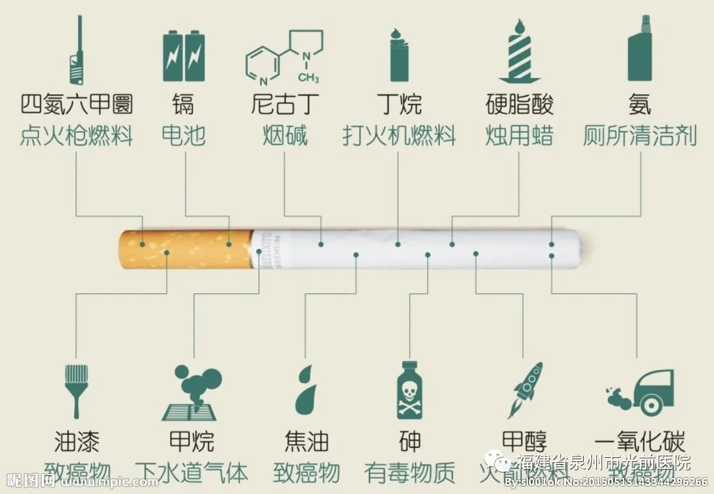 煙草燃燒所產(chǎn)生的煙霧是由7000多種化合物所組成的復雜混合物,其中氣體占95%,如一氧化碳、氫化氰、揮發(fā)性亞硝胺等,顆粒物占5%,包括半揮發(fā)物及非揮發(fā)物,如煙焦油、尼古丁等。這些化合物絕大多數(shù)對人體有害,其中至少有69種為已知的致癌物,如多環(huán)芳烴、亞硝胺等,而尼古丁是引起成癮的物質(zhì)。