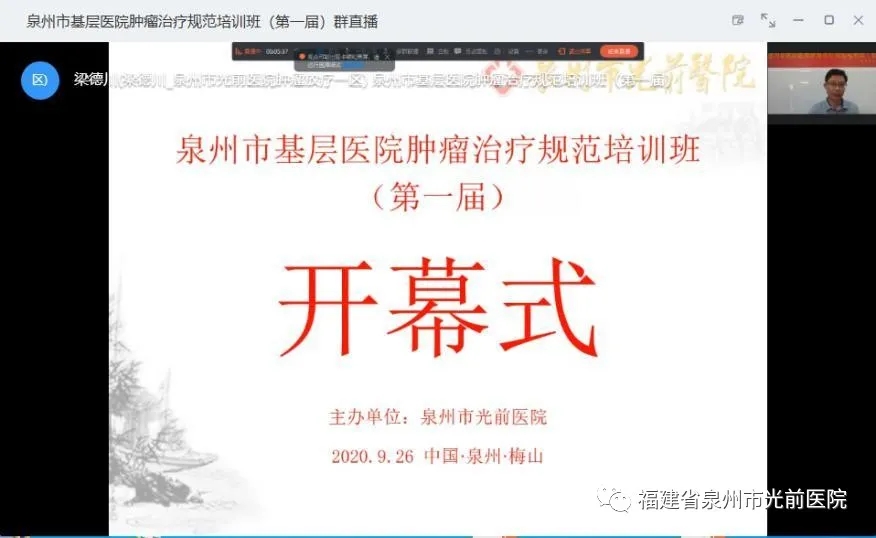 9月26日,泉州市基層醫(yī)院腫瘤治療規(guī)范培訓(xùn)班(第一期)在我院學(xué)術(shù)廳直播間正式舉行,這也是2020年度泉州市衛(wèi)健委繼續(xù)教育備案項(xiàng)目中的第一場線上培訓(xùn)班,釘釘網(wǎng)絡(luò)直播,全程366分鐘。