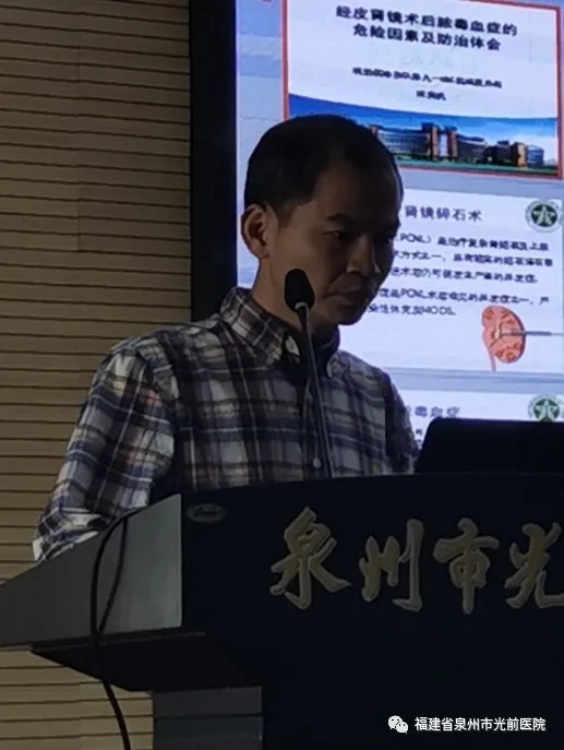 來自解放軍第910醫(yī)院的林榮凱教授精心講解了PCNL尿膿毒血癥的防治;我院泌尿外科主治醫(yī)師林金鏈講解了超聲引導下PCNL術常見并發(fā)癥和處理及病例分享;我院腫瘤化療科楊宇輝副主任醫(yī)師講解了晚期腎癌的綜合治療;我院泌尿外科醫(yī)師張劍文醫(yī)師分享了前列腺電切術后膀胱頸攣縮探討;來自福建醫(yī)科大學附屬第二醫(yī)院的陳俊毅教授精心講解了PIDT前列腺癌診療一體化中心;泉州市第一醫(yī)院的葉燕樂教授精心講解了前列腺穿刺中國專家共識解讀。參會現(xiàn)場的泉州市及武漢市泌尿外科專家及同道對泌尿系結石 、前列腺增生、晚期腎癌、前列腺癌等泌尿外科熱點話題進行了深入的討論,現(xiàn)場學術討論氣氛十分熱烈。