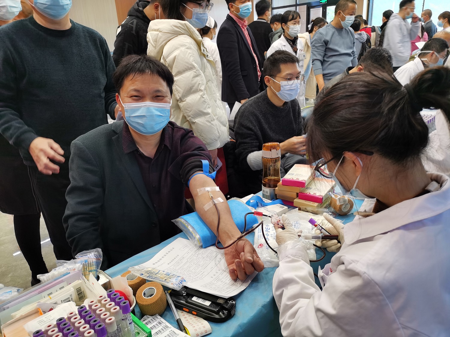 滴血潤(rùn)新生。在志愿者的引導(dǎo)下,我院?jiǎn)T工有序完成測(cè)溫流調(diào)、申請(qǐng)表填寫、血壓測(cè)量、獻(xiàn)血前初篩檢驗(yàn)等項(xiàng)目,順利通過后進(jìn)行采血。血站醫(yī)護(hù)人員在采血的同時(shí),為所有獻(xiàn)血人員準(zhǔn)備了一份小禮物,并交代獻(xiàn)血后的注意事項(xiàng)。在獻(xiàn)血隊(duì)伍中,有臨床一線醫(yī)護(hù)人員,也有行政、后勤人員,有年年堅(jiān)持無償獻(xiàn)血的“獻(xiàn)血之星”,也有首次參與活動(dòng)的“獻(xiàn)血新星”。他們?cè)谶@春寒料峭的日子里勇敢地?cái)]起袖管,獻(xiàn)出涓涓熱血,讓一份份愛心與真情傳遞。大家臉上都洋溢著笑容,感受到了愛心奉獻(xiàn)給自身帶來的溫暖與幸福、光榮與自豪。正是這樣一群又一群可親、可敬的人,不斷貢獻(xiàn)自己的力量,為生命接力?;顒?dòng)現(xiàn)場(chǎng)氣氛熱烈,獻(xiàn)血隊(duì)伍秩序井然,溫情暖暖。