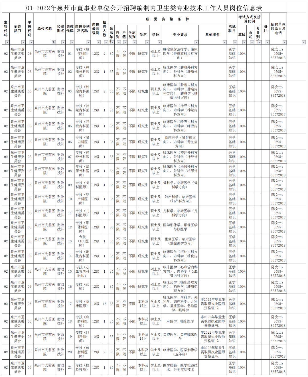 2022年泉州市直事業(yè)單位公開招聘編制內(nèi)衛(wèi)生類專業(yè)技術(shù)工作人員崗位信息表