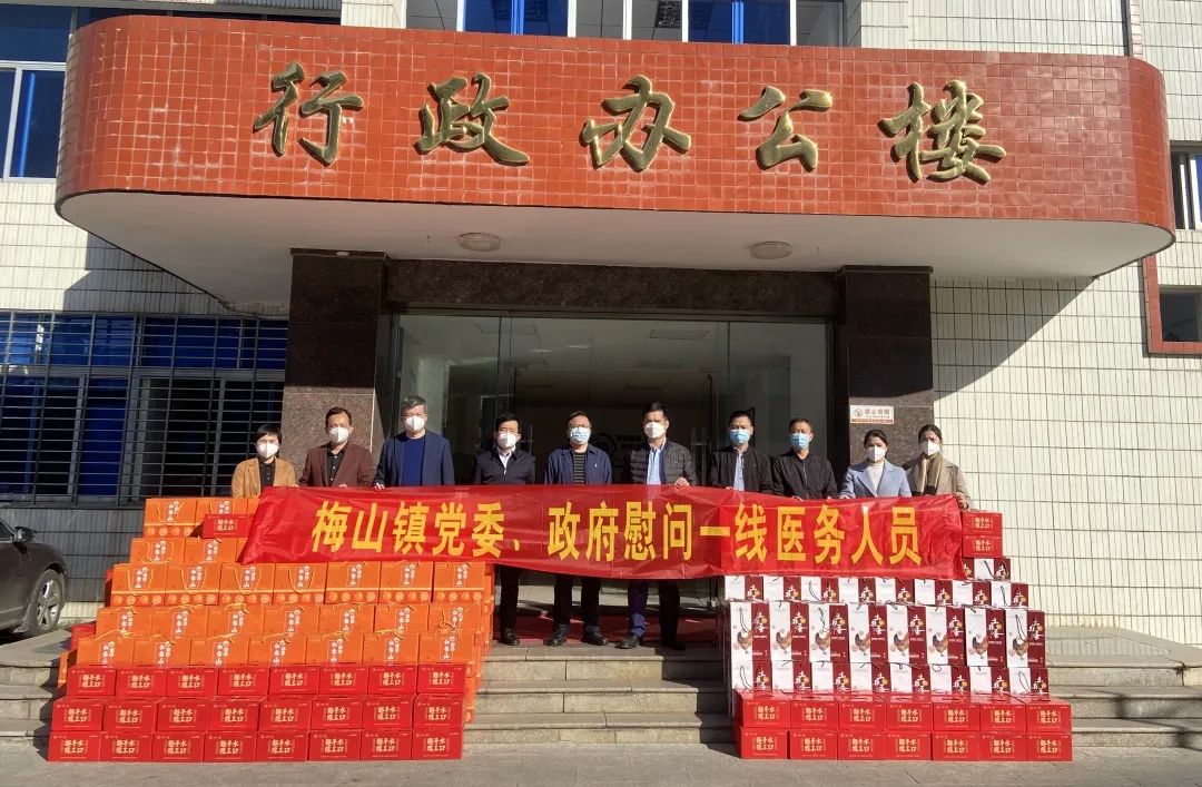 為關(guān)心關(guān)愛抗疫一線醫(yī)務(wù)人員,提振士氣,鼓舞干勁,1月7日,梅山鎮(zhèn)黨委書記陳貫明、鎮(zhèn)長(zhǎng)施能利帶隊(duì)來院為抗疫一線醫(yī)務(wù)人員送上關(guān)懷和慰問。