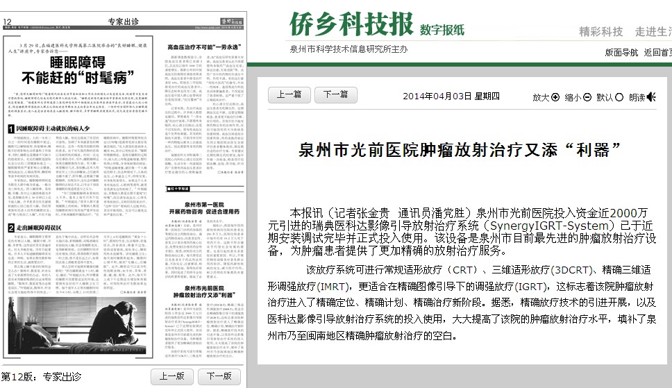 泉州市光前醫(yī)院腫瘤放射治療又添“利器”(《僑鄉(xiāng)科技報》)