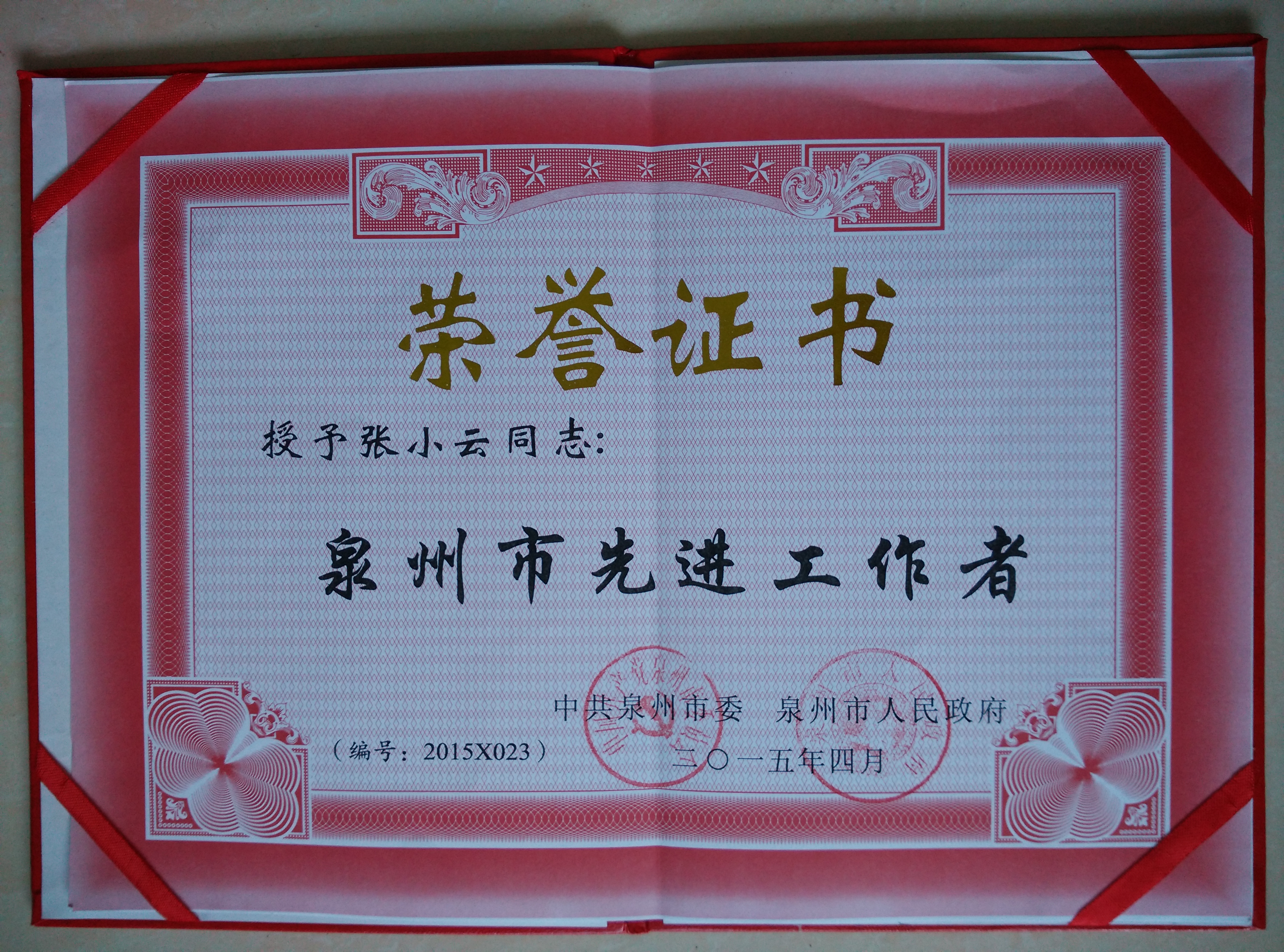 2015年4月,中共泉州市委、市人民政府授予張小云同志“泉州市先進(jìn)工作者”榮譽(yù)稱號(hào)。