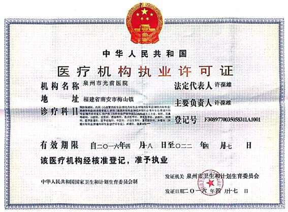 泉州市光前醫(yī)院醫(yī)療機構(gòu)執(zhí)業(yè)許證