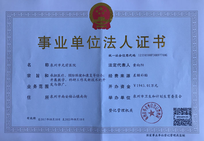 泉州市光前醫(yī)院事業(yè)單位法人證書
