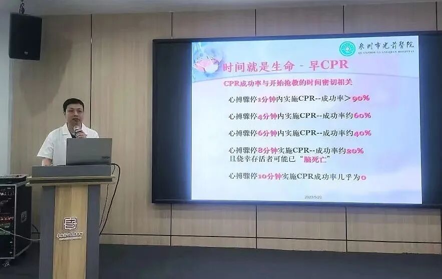 急診科主任戴劍結(jié)合PPT,生動直觀地為大家講解了心臟驟停下施救時間的重要性、如何抓住寶貴的急救“黃金4分鐘”等急救知識。同時,圍繞心肺復(fù)蘇操作步驟進(jìn)行了詳細(xì)地解讀,重點講解了如何評估環(huán)境安全、如何正確識別患者意識情況,以及如何正確發(fā)力按壓。