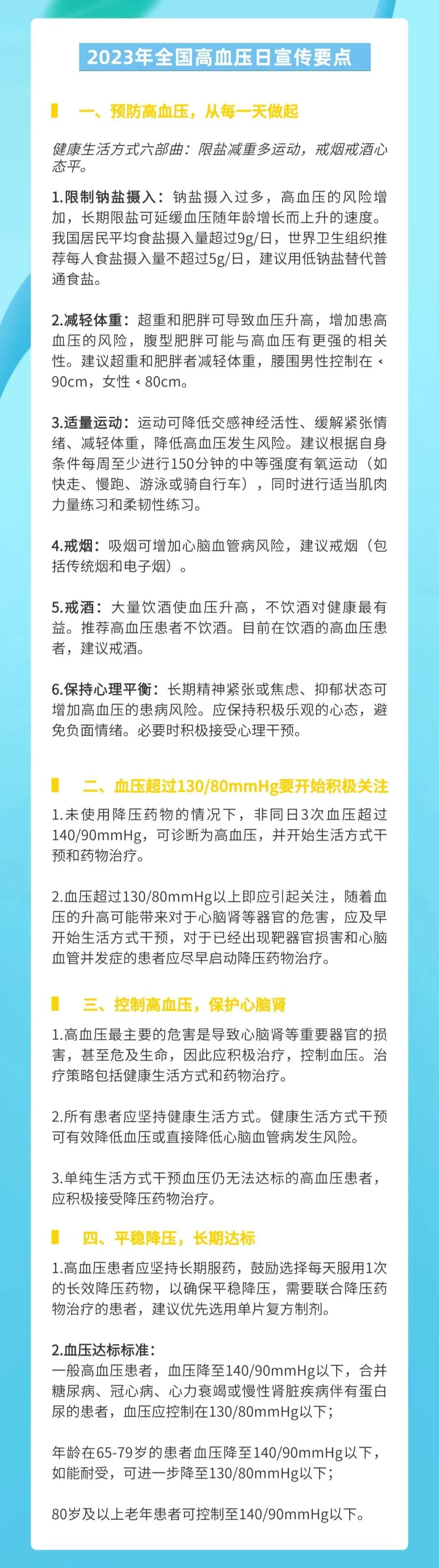 2023年10月8日是第26個全國高血壓日,活動主題是“健康生活,理想血壓”。國家衛(wèi)生健康委發(fā)布《2023年全國高血壓日宣傳要點》,旨在指導(dǎo)群眾做好自我血壓管理,有效控制高血壓危險因素,切實提高高血壓知曉率、治療率和控制率。