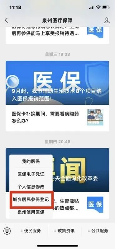 1.關(guān)注“泉州醫(yī)療保障”微信公眾號(hào),進(jìn)入【便民服務(wù)】-【城鄉(xiāng)居民參保登記】。