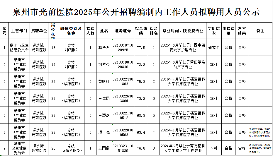 根據(jù)《2025年泉州市事業(yè)單位公開招聘編制內(nèi)工作人員公告》規(guī)定的條件和程序,在公開報名、筆試、體檢及考核合格的基礎(chǔ)上,擬聘用:戴詩燕、劉紫芬、黃啊紅、王建昆、王穎盈、項亮、王雨欣等7位同志為泉州市光前醫(yī)院工作人員,現(xiàn)予公示。公示時間2025年8月13日至2025年8月19日,公示5個工作日。